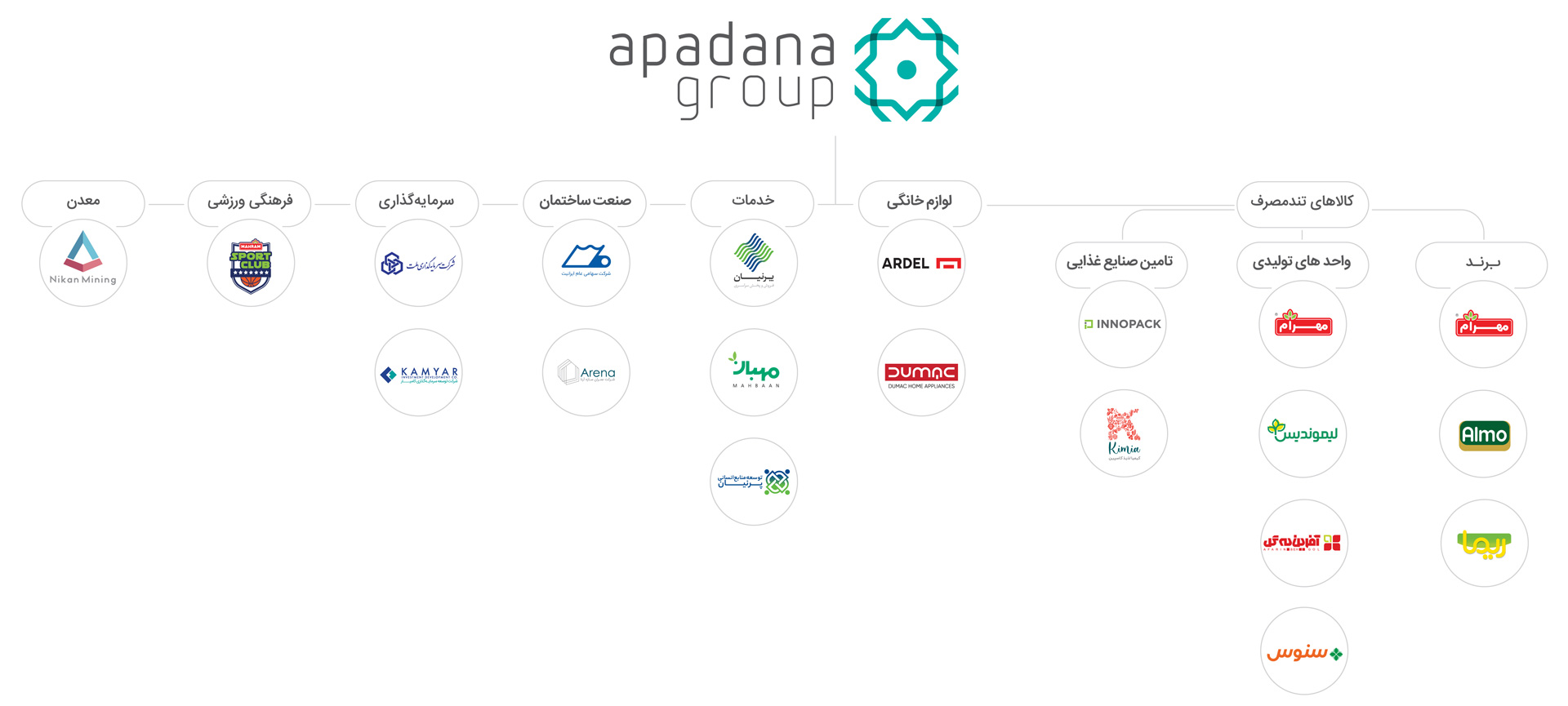 گروه آپادانا سرمایه‌گذاری در زنجیرهٔ ارزش غذایی را به‌عنوان بخش اصلی فعالیت هلدینگ در نظر گرفته‌است. مالک ۴ برند مهرام، آلمو، ریما، و بالسی